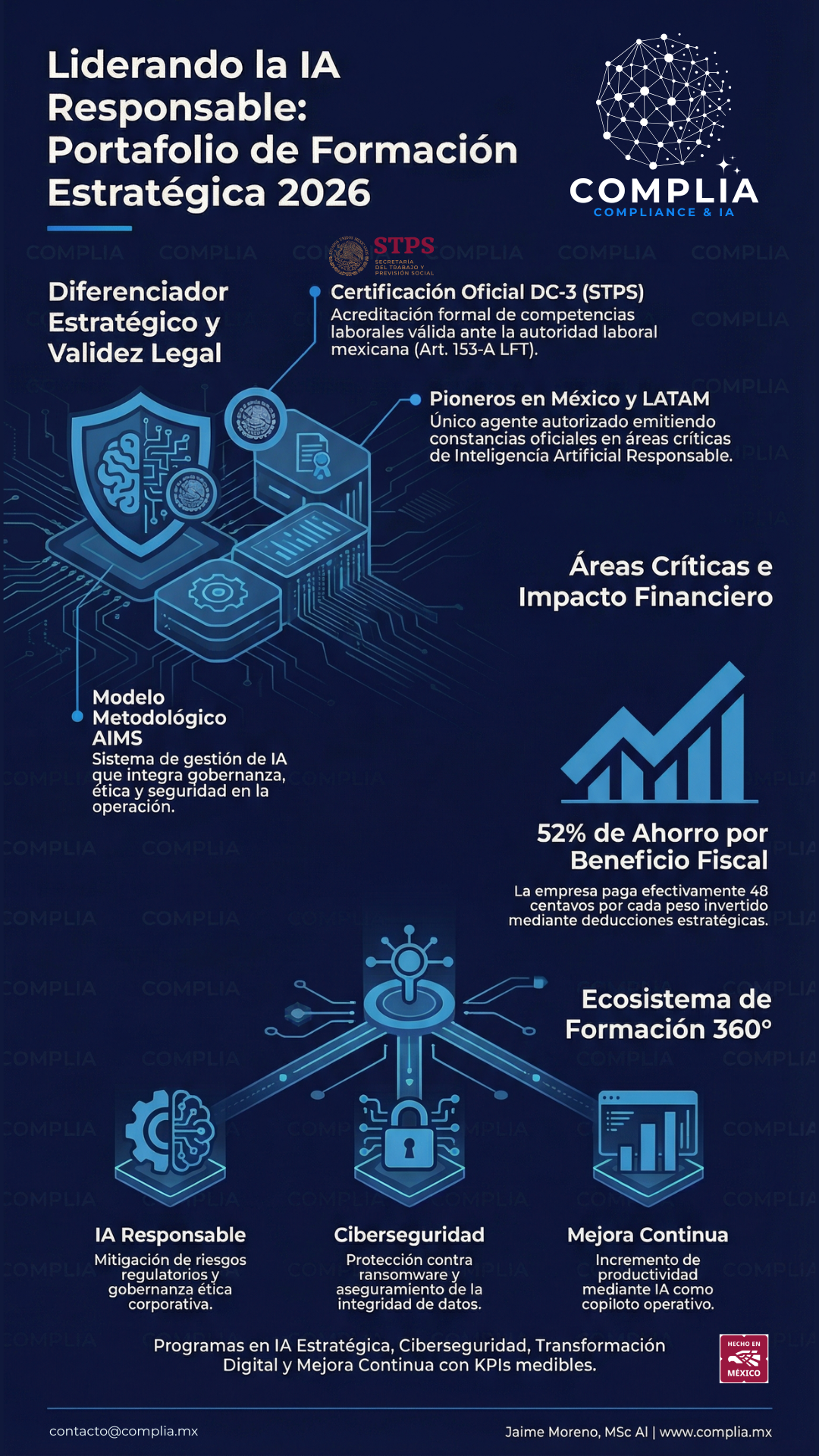 Este portafolio integra los programas de formación ejecutiva y operativa de COMPLIA, impartidos por Agente Capacitador Externo (ACE) autorizado por la Secretaría del Trabajo y Previsión Social, con emisión de Constancias de Competencias o Habilidades Laborales (DC-3) válidas conforme a la legislación laboral mexicana.